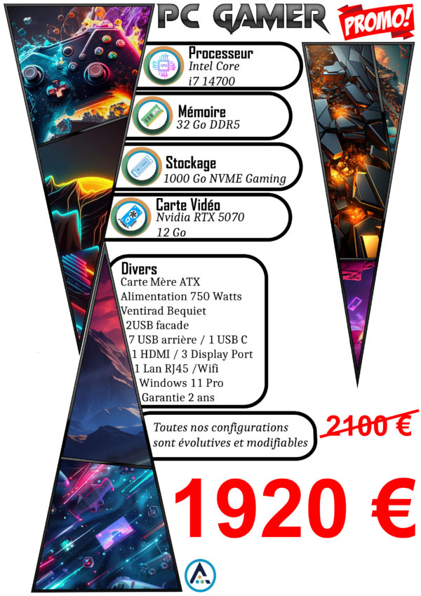🔥 Repoussez les limites avec notre configuration Intel i7-14400F, RTX 5070 (12 Go), 32 Go DDR5 et SSD NVMe 1 To. La performance à l’état pur, au service de votre passion du jeu ! 🚀