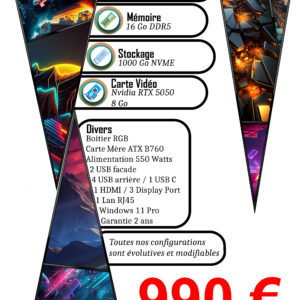 • SSD NVMe 1000 Go : Un stockage haute vitesse pour des chargements instantanĂ©s et une grande capacitĂ© pour vos jeux et projets.