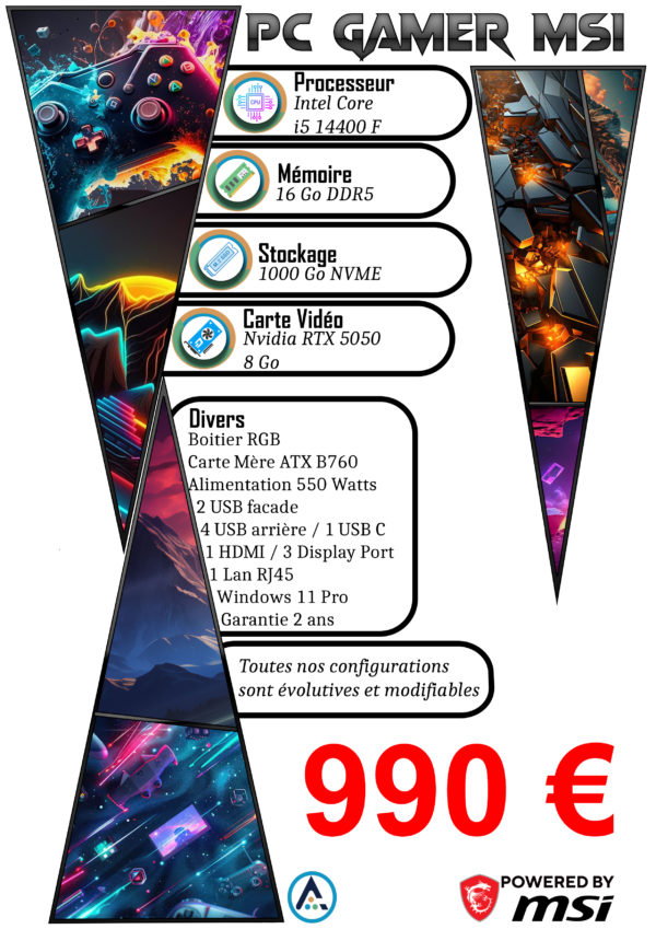 🔥 Profitez d’un équilibre idéal entre puissance et accessibilité avec notre configuration Intel i5-14400F, RTX 5050 (8 Go), 16 Go DDR5 et SSD NVMe 1 To. La performance maîtrisée au service de votre passion du jeu ! 🚀